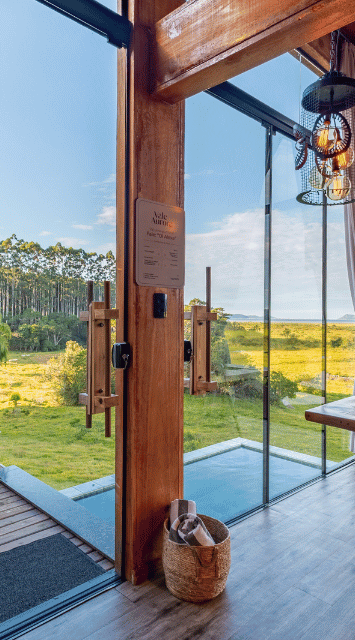 O ambiente acolhedor conta com uma lareira interna e externa, além de uma decoração charmosa composta por peças de um artista regional, criando uma atmosfera única. E, para completar, a vista deslumbrante da lagoa e do mar torna a experiência ainda mais inesquecível.