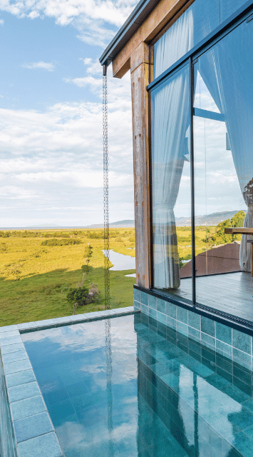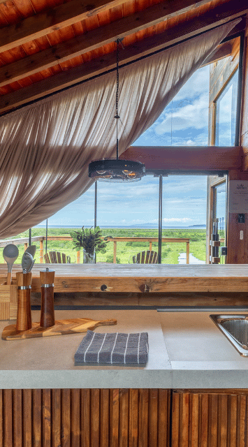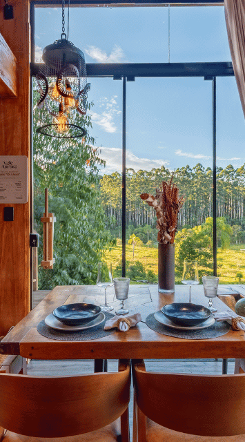 O ambiente é aconchegante, com uma lareira interna e externa e decoração feita com peças de um artista regional, criando uma atmosfera única. E, claro, a vista para a lagoa e o mar torna a experiência ainda mais especial.