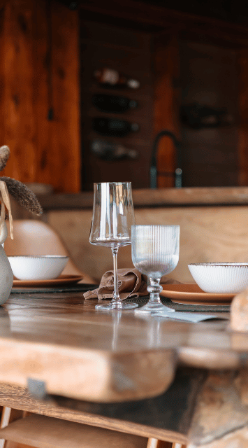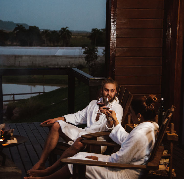 Estrutura: suíte para casal com cama no mezanino, sala de estar, sala de TV, sala de jantar, cozinha, varanda, banheiro e ducha com vista para a natureza.
